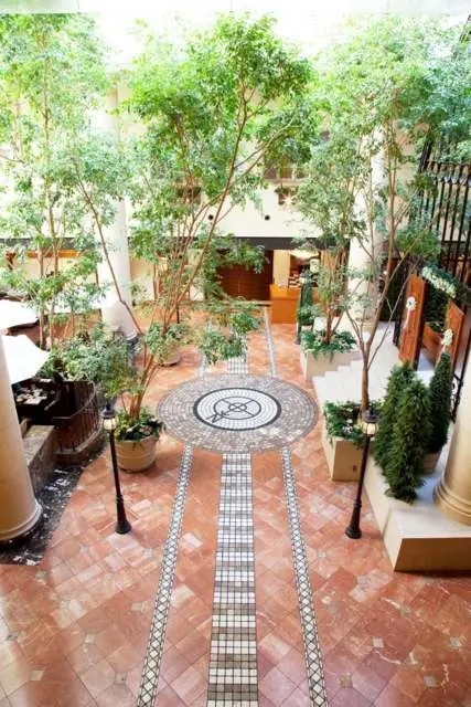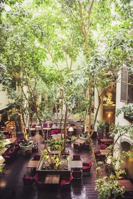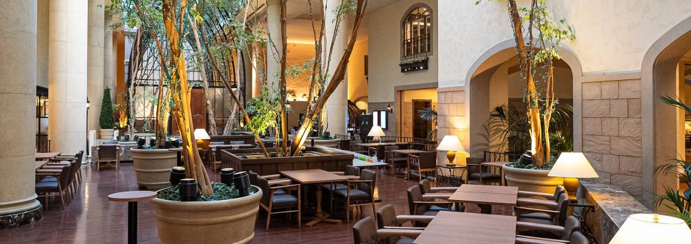 幸せの木“ベンジャミン”の緑と木漏れ日に包まれた、誰もが自然体でいられる空間。天候や暑さ寒さにも左右されない為ゲストも安心です。