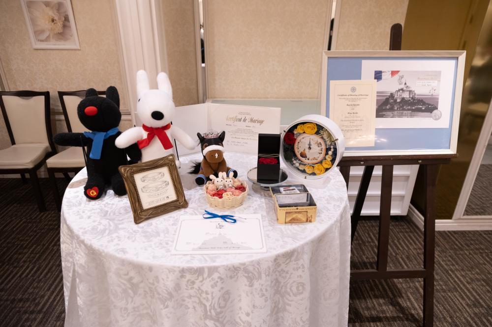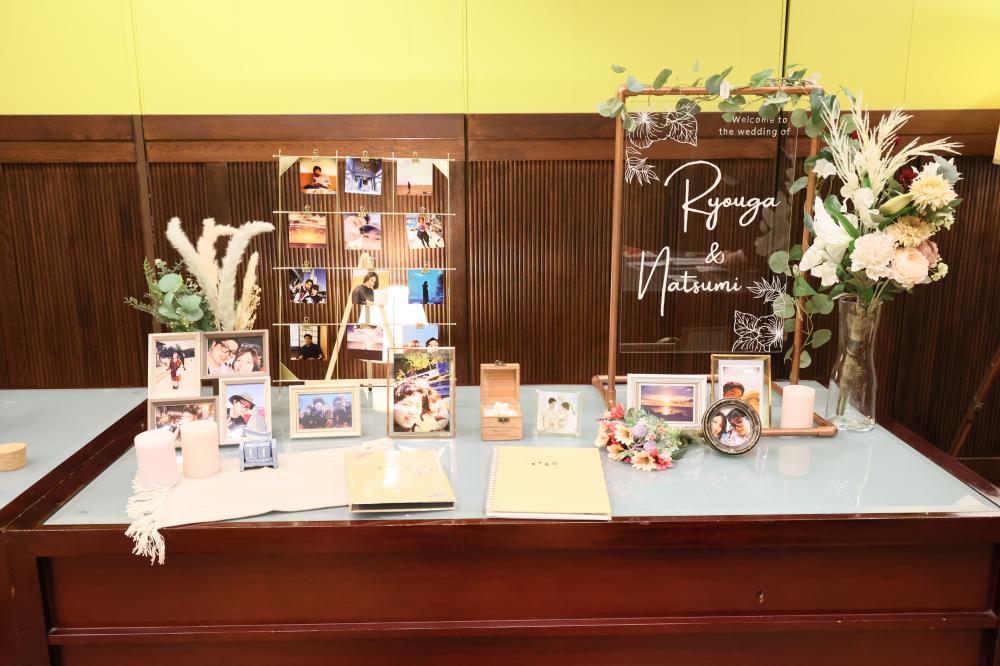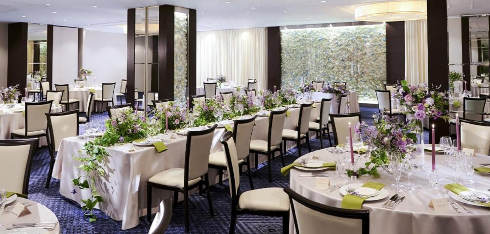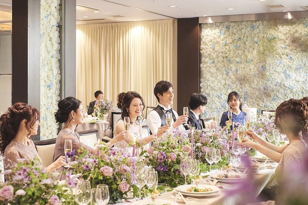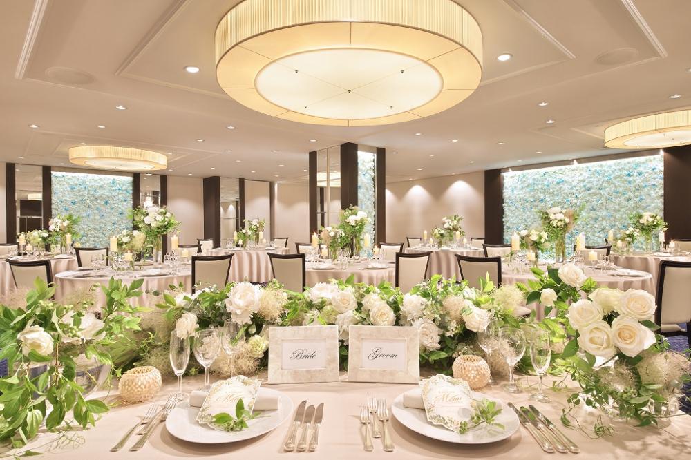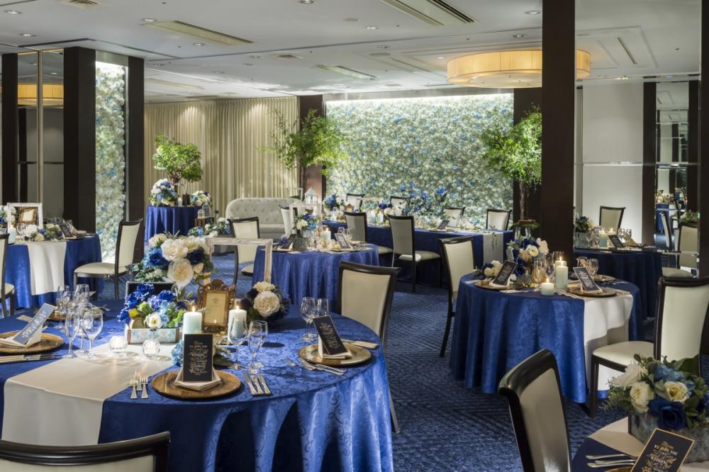 ブルー&ホワイトのローズが壁一面に敷き詰められた清楚で透明感のある会場。上品で優しい時間の流れと心からのおもてなしが、ゲストの心に深く想い出を刻みます。