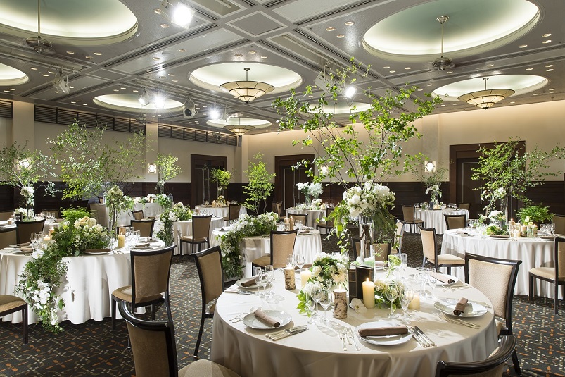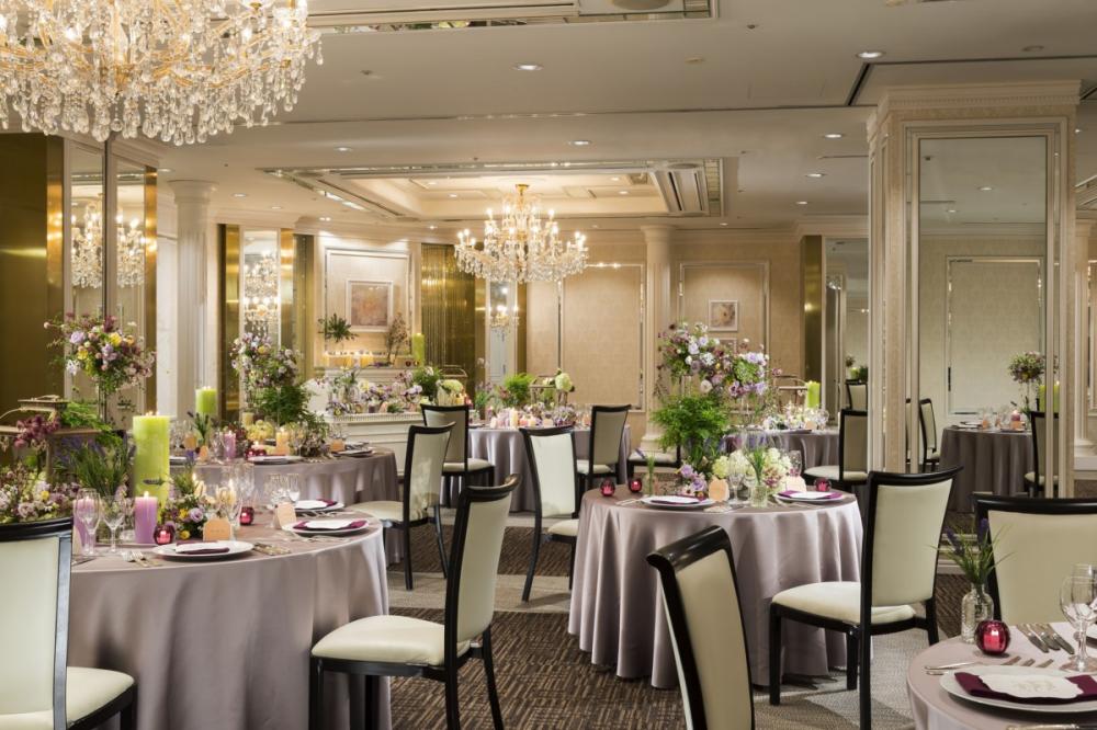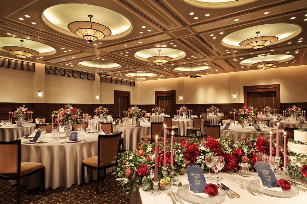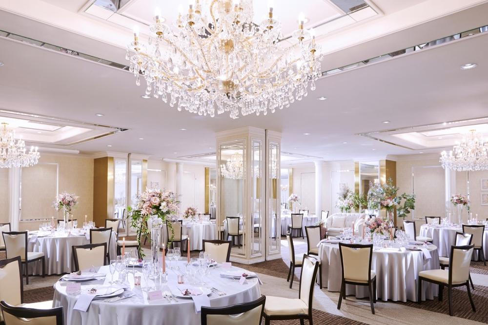 クリスタルとシャンデリアの輝くエレガントなデザイン。天井には華やかなシャンデリアが輝き、洗練された優雅な空間を、おふたりらしいおもてなしでご堪能いただけます。