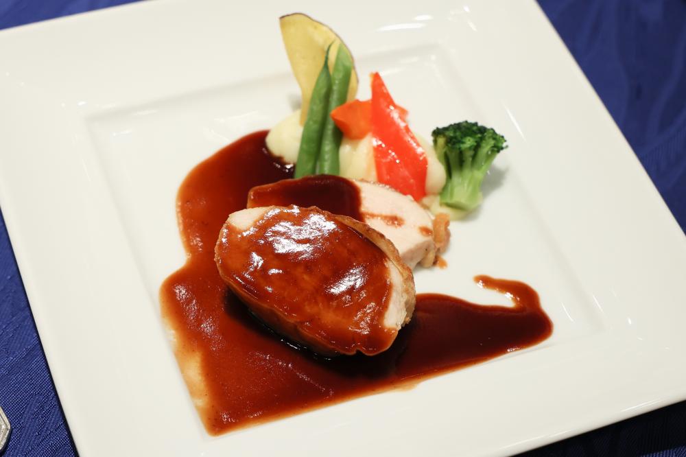 ・大山鶏のロースト赤ワインソース マッシュポテト 彩り野菜とチップ添え